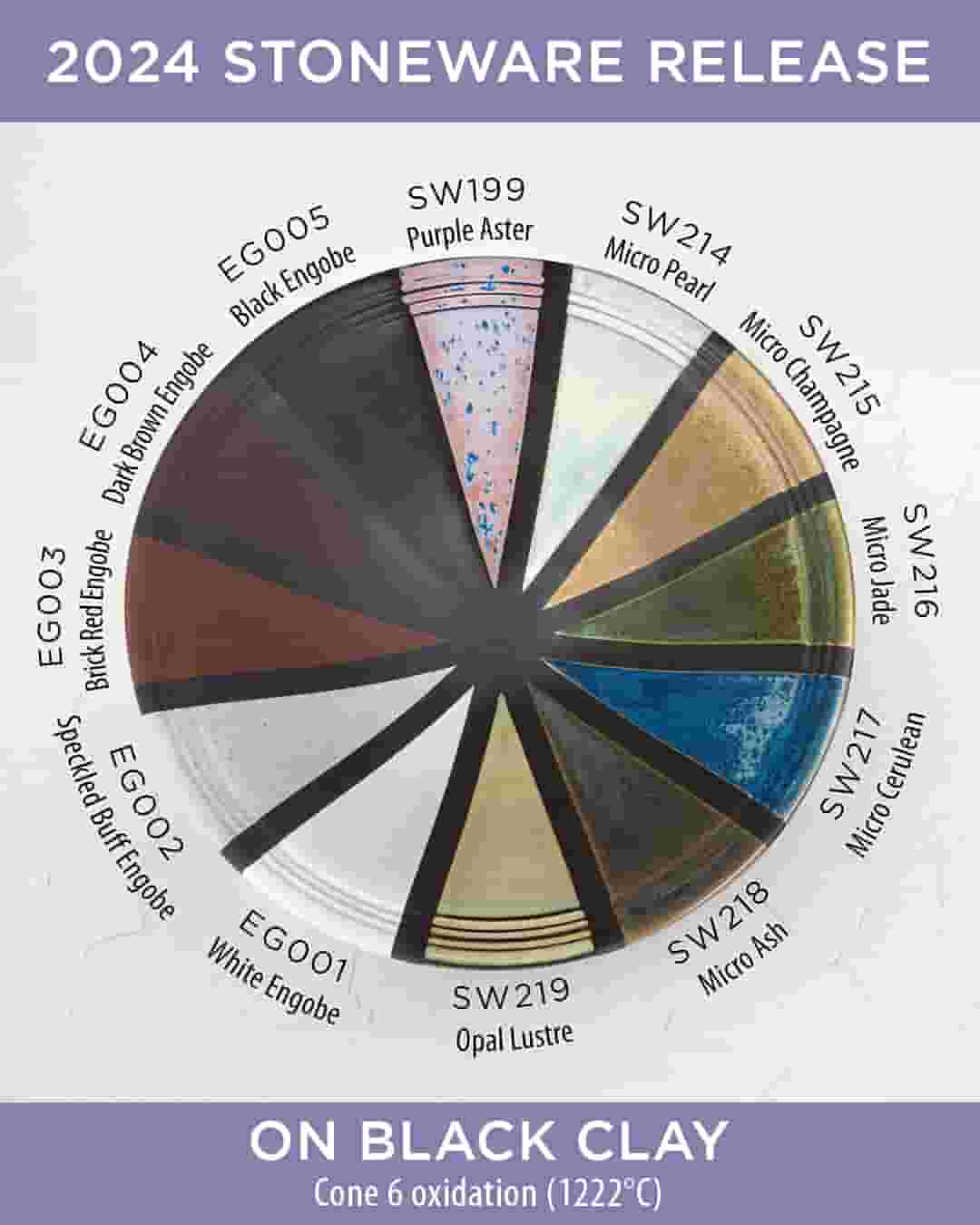 Engobes are used to coat your clay body to your preferred finish/color and are a great base to achieve variability in your glaze results. Chips shown are fired flat on a white clay body fired to cone 6 oxidation and cone 10 reduction. The choice of clay body, the thickness of glaze application, the firing process, and temperature will affect the fired results.
