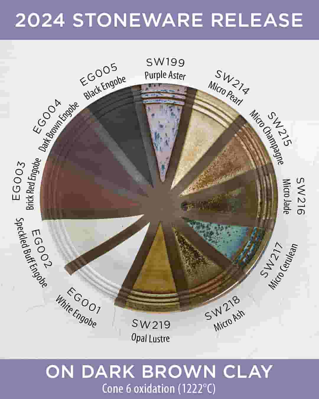 Engobes are used to coat your clay body to your preferred finish/color and are a great base to achieve variability in your glaze results. Chips shown are fired flat on a white clay body fired to cone 6 oxidation and cone 10 reduction. The choice of clay body, the thickness of glaze application, the firing process, and temperature will affect the fired results.