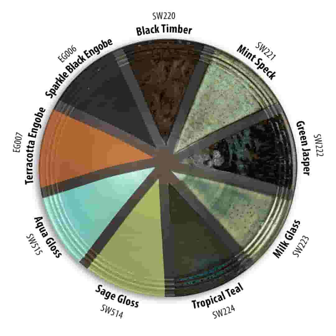 Engobes are used to coat your clay body to your preferred finish/color and are a great base to achieve variability in your glaze results. Chips shown are fired flat on a white clay body fired to cone 6 oxidation and cone 10 reduction. The choice of clay body, the thickness of glaze application, the firing process, and temperature will affect the fired results.